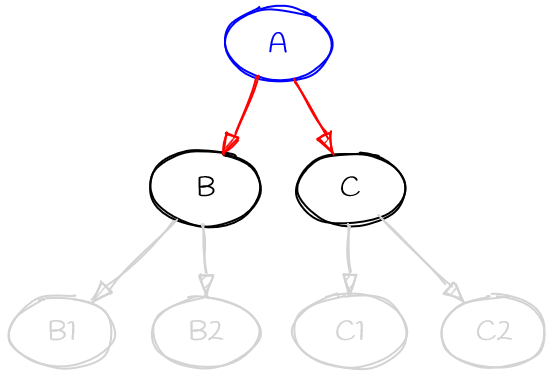 When the provider is asked to choose between the red requirements (A->B and A->C) it doesn’t know anything about the dependencies of B or C (i.e., the grey parts of the graph).